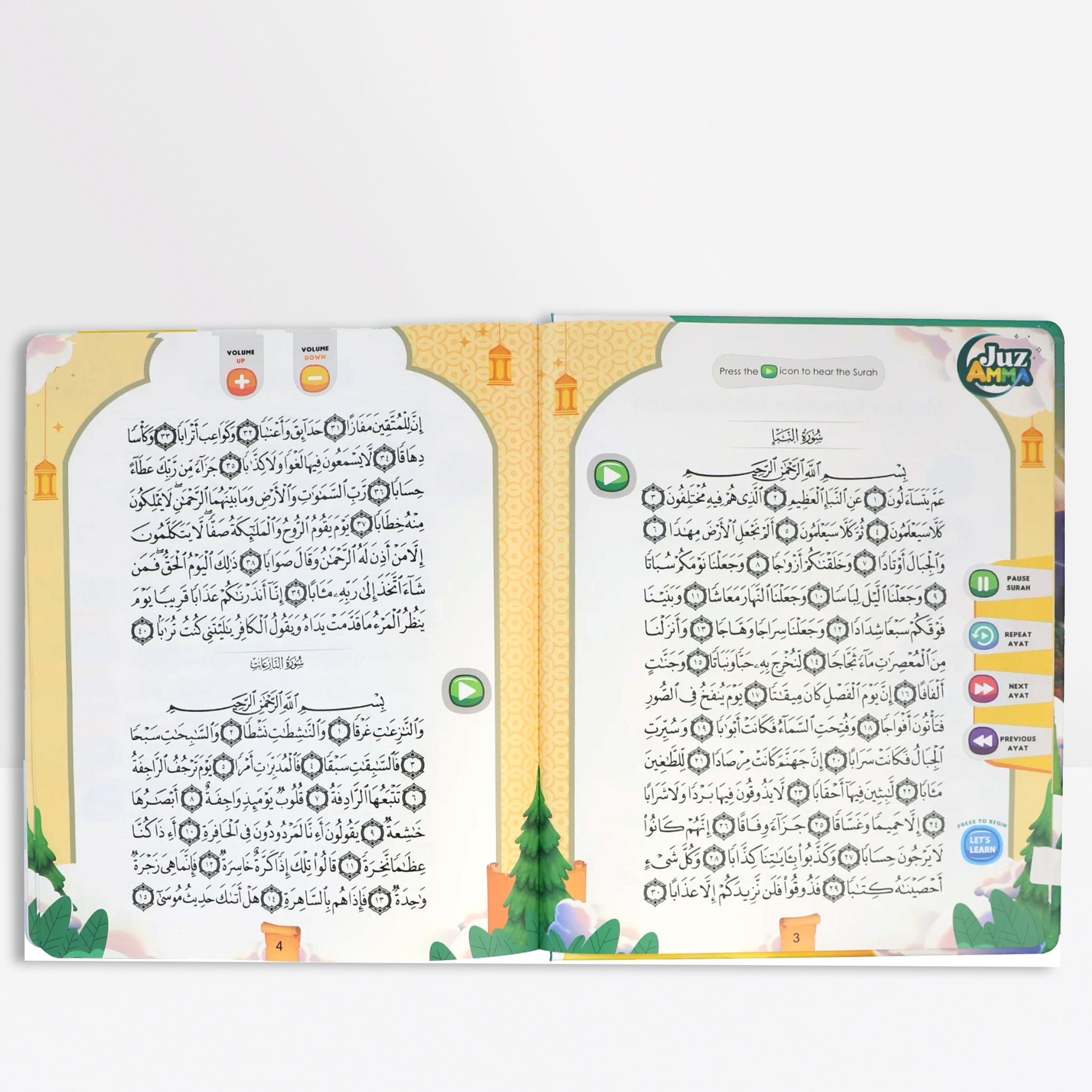 ist ein interaktives und kindgerechtes Hörbuch, das Kindern dabei hilft, die Verse des Juz Amma zu hören, zu verstehen und leichter zu lernen. Es enthält hochwertige Audioaufnahmen jeder Sure, rezitiert vom legendären Rezitator Mahmoud Khalil Al-Hussary. Dank der benutzerfreundlichen Navigation können Kinder ihre Lieblingssuren (Ayat) ganz einfach auswählen, beliebig oft anhören und gleichzeitig dem Text folgen. So wird das Lernen und Auswendiglernen spielerisch und besonders leicht.